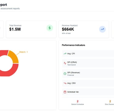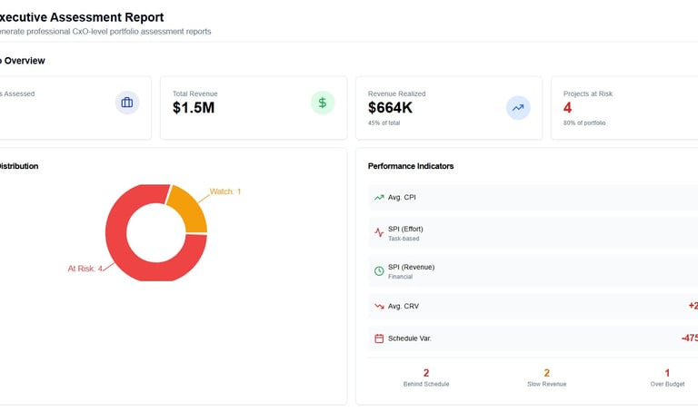 Provides executive leaders with a comprehensive view of all projects, offering a snapshot of project status, effort utilization, revenue earned, and risks—all in one place. Deliver board-level portfolio narratives with explicit leadership actions — not just dashboards that require interpretation.