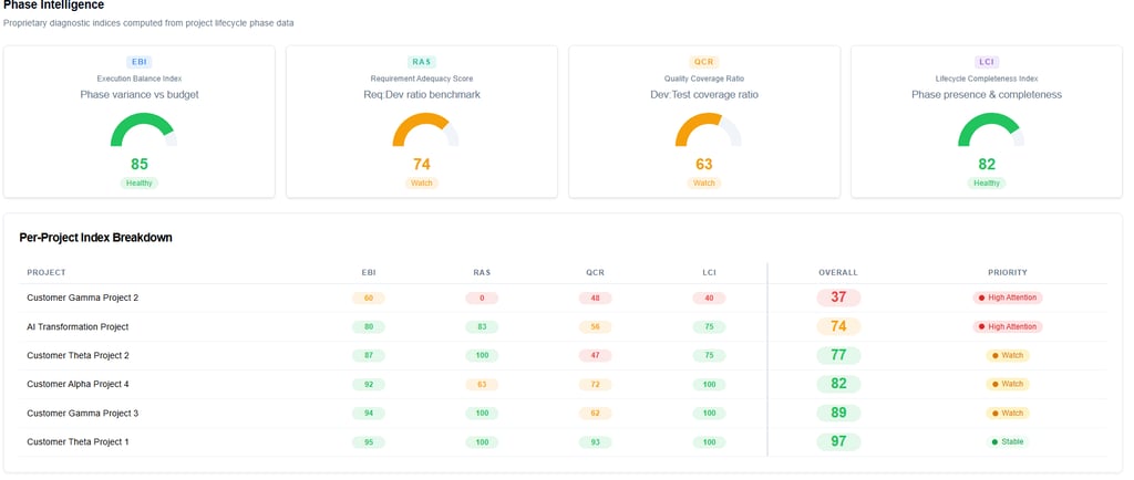Execution failures are rarely sudden—they are structural. Phase-level diagnostics expose imbalance early, enabling course correction before issues manifest in cost, schedule, or quality deviations. That's where the four structural indices drill down: